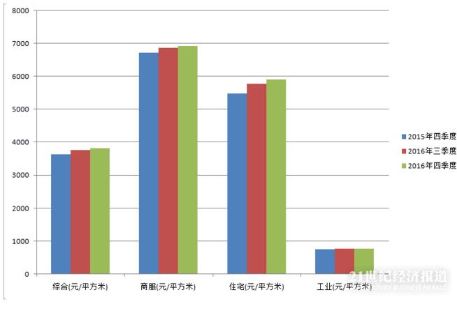 2016年第四季度,全國主要監測城市地價總體水平為3826元/平方米,商服、住宅、工業地價分別為6937元/平方米、5918元/平方米和782元/平方米。