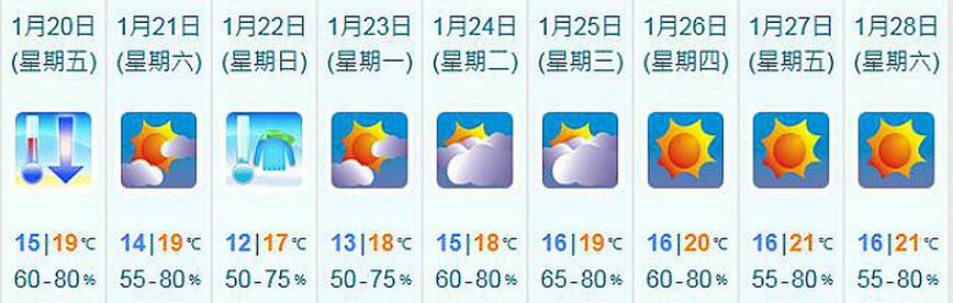 最新天氣預測顯示,下周日約13度至18度,至下周三將回升至16至19度,至下周五及周末(年三十及年初一)更達16至21度。而在相對濕度方面,下周大致維持在50%至80%之間,其中下周一最低相對濕度會跌至50%,最高75%。