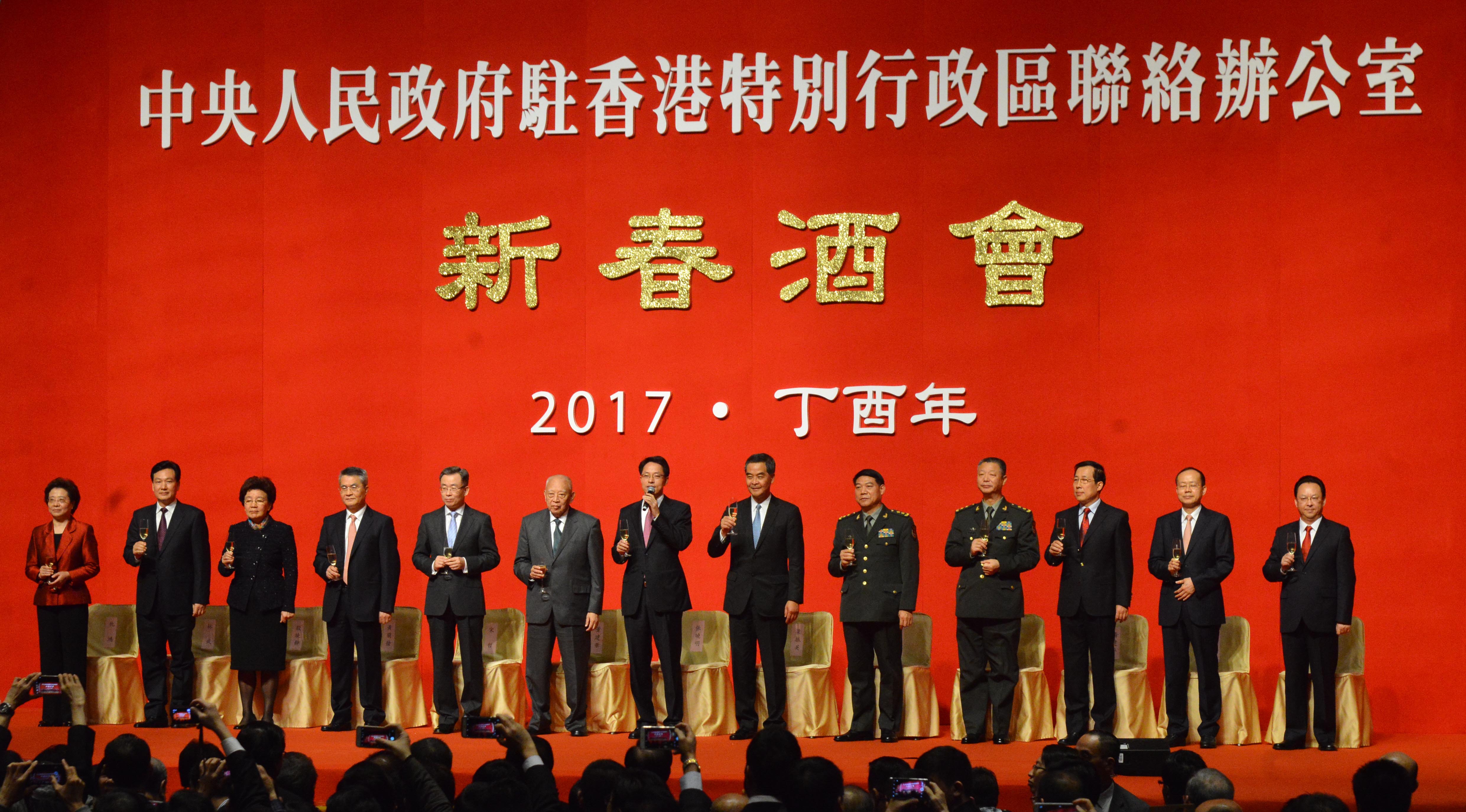 中联办2017新春酒会昨晚在香港会展中心举行,全国政协副主席董建华,特区行政长官梁振英,中联办主任张晓明,外交部驻港特派员公署特派员宋哲,解放军驻港部队司令员谭本宏、政委岳世鑫及来自中央驻港机构、香港特区政府、社会各界、驻港中资企业和外国驻港领事馆的4000余名嘉宾出席。记者 蔡启文摄