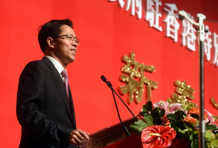 晚上6時,歡快的樂曲聲響起,張曉明等步入會場,酒會正式開始。中聯辦秘書長許東主持酒會。張曉明代表中聯辦向出席酒會的嘉賓表示熱烈的歡迎和衷心的感謝,向730萬香港市民致以新春的祝福,并發表了題為《不忘初心穩中求進》的新春致辭。