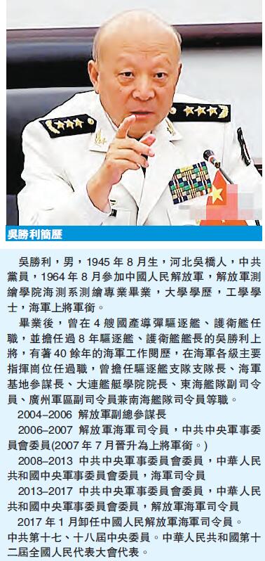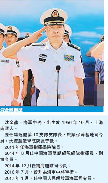 【香港商报网讯】在航母编队横跨四大海域训练北上返航青岛不久,中国海军司令宣告换人。内地官媒昨日在一场海军将官军衔晋升活动中透露,南海舰队司令沈金龙中将挂帅接替吴胜利上将出任海军司令。分析人士认为,在海军历任司令员中,除了开国将领之外,沈金龙是首位直接从舰队司令员升任海军司令员的海军将领。这和沈金龙在南海岛礁争端白热化之际挂帅南海舰队,处理多起敏感危机事件有直接关联。还有分析指,在中美海军南海对峙的敏感时刻,此次的任命可谓是「火线提拔」,更被视为是2017年军方人事布局的开始。