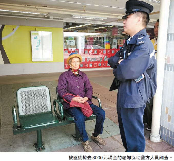 不幸遇上宵小的婆婆姓伍(79岁),据悉她与家人同住沙田乙明邨明耀楼一单位。据伍婆婆表示,因农历新年将至,昨晨9时许专程到附近沙角邨商场一间银行提取3000元预备过年之用,另又转帐12万元到幼子的户口,当她完成手续後,把3000元现金夹在存摺内,放入一个枣红色的环保袋便离开。