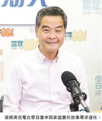 梁振英早前已宣布不會競逐連任,他昨早出席商台節目時,明顯已無「太多包袱」,接受訪問時明顯「較放」,更首度透露心聲。他驀然回首說,早前女兒梁齊昕入了醫院兩個月,期間既要兼顧工作和家庭,坦言感到很吃力。