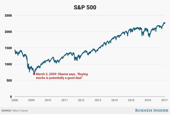2009年1月20日,奧巴馬宣誓就職美國總統。一個多月之后的3月3日,奧巴馬于一個近乎完美的時點提出建議,可能是時候買股票了。