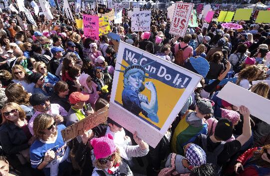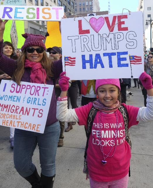 大批芝加哥民众21日涌上街头,举行“妇女大游行”抗议活动。
