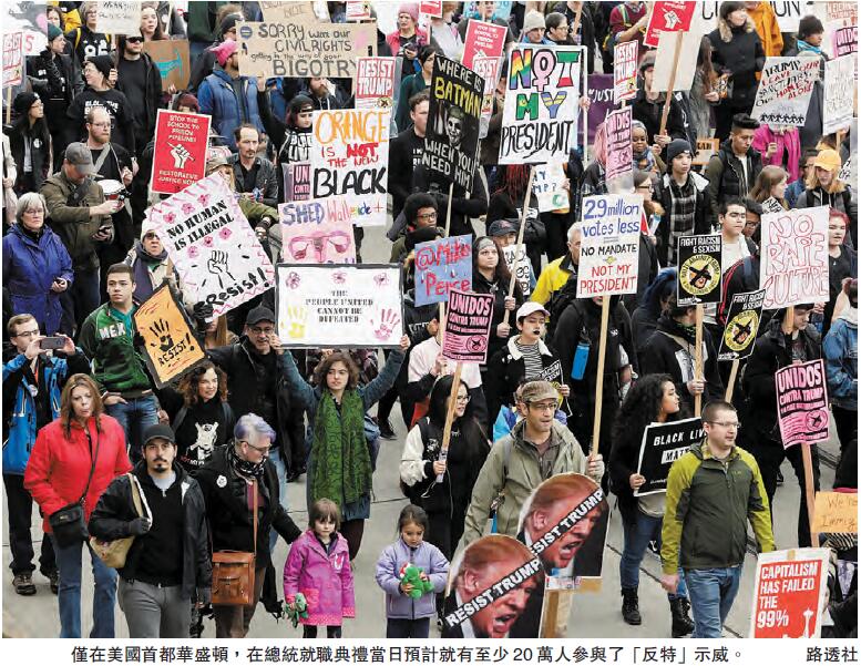 总统就职日前后,特朗普反对者组织的抗议示威规模打破以往总统就职日的相关示威纪录。昨日,首都华盛顿和美国多地还将举行名为「妇女大游行」的抗议活动,仅华盛顿预计参与人数就达20万。有分析指出,特朗普以「让美国再次伟大」的口号成功入主白宫,不过他不是传统的政治人物,其国内外政策走向引人关注。据悉,约有60位民主党国会议员没有参加特朗普的就职典礼,特朗普就任后面临着弥合国内分裂的任务。