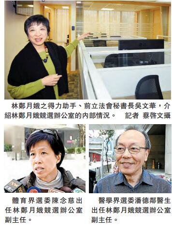 除有新辦公室,也有新共事者,其中一名為體育界選委、香港羽毛球代表隊前成員陳念慈,加入林鄭競選辦出任副主任。陳念慈昨早到林鄭競選辦開會前見記者,她指是在林鄭月娥宣布參選後翌日邀請她加入競選團隊。陳念慈說,林鄭月娥出任社會福利署署長期間,有份推動成立5000萬元種子基金,協助殘奧運動員,令她印象深刻,她相信所有體育界選委都會支持林鄭月娥。