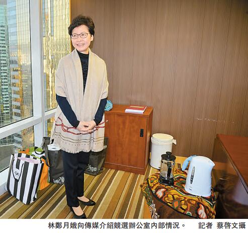 林鄭月娥昨日開放約1800呎的競選辦公室予傳媒參觀及拍攝,與其得力助手、前立法會秘書長吳文華一同介紹其競選辦公室。她表示辦公室地方淺窄,由於時間緊迫,在本月17日承租一家科技公司,租下辦公室時已經連同所有家具及裝修,否則難以早日開始運作。對於新辦公室會否「屈就」自己,林鄭指辦公室能看到維港景色,比想像中好得多,且位置四通八達,因此沒什麼大問題。她提到,新辦公室與其他人的距離較小,方便召集團隊一起討論、開會或食飯,氣氛會更好。