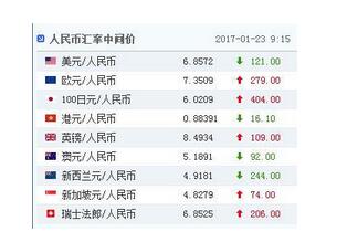 中國人民銀行授權中國外匯交易中心公布,2017年1月23日銀行間外匯市場人民幣匯率中間價為:1美元對人民幣6.8572元,1歐元對人民幣7.3509元,100日元對人民幣6.0209元,1港元對人民幣0.88391元,1英鎊對人民幣8.4934元,1澳大利亞元對人民幣5.1891元,1新西蘭元對人民幣4.9181元,1新加坡元對人民幣4.8279元,1瑞士法郎對人民幣6.8525元,1加拿大元對人民幣5.1520元,人民幣1元對0.64560馬來西亞林吉特,人民幣1元對8.6927俄羅斯盧布,人民幣1元對1.9841南非蘭特,人民幣1元對170.47韓元,人民幣1元對0.53554阿聯酋迪拉姆,人民幣1元對0.54682沙特里亞爾,人民幣1元對42.0930匈牙利福林,人民幣1元對0.59465波蘭茲羅提,人民幣1元對1.0117丹麥克朗,人民幣1元對1.2945瑞典克朗,人民幣1元對1.2234挪威克朗,人民幣1元對0.54969土耳其里拉,人民幣1元對3.1382墨西哥比索。