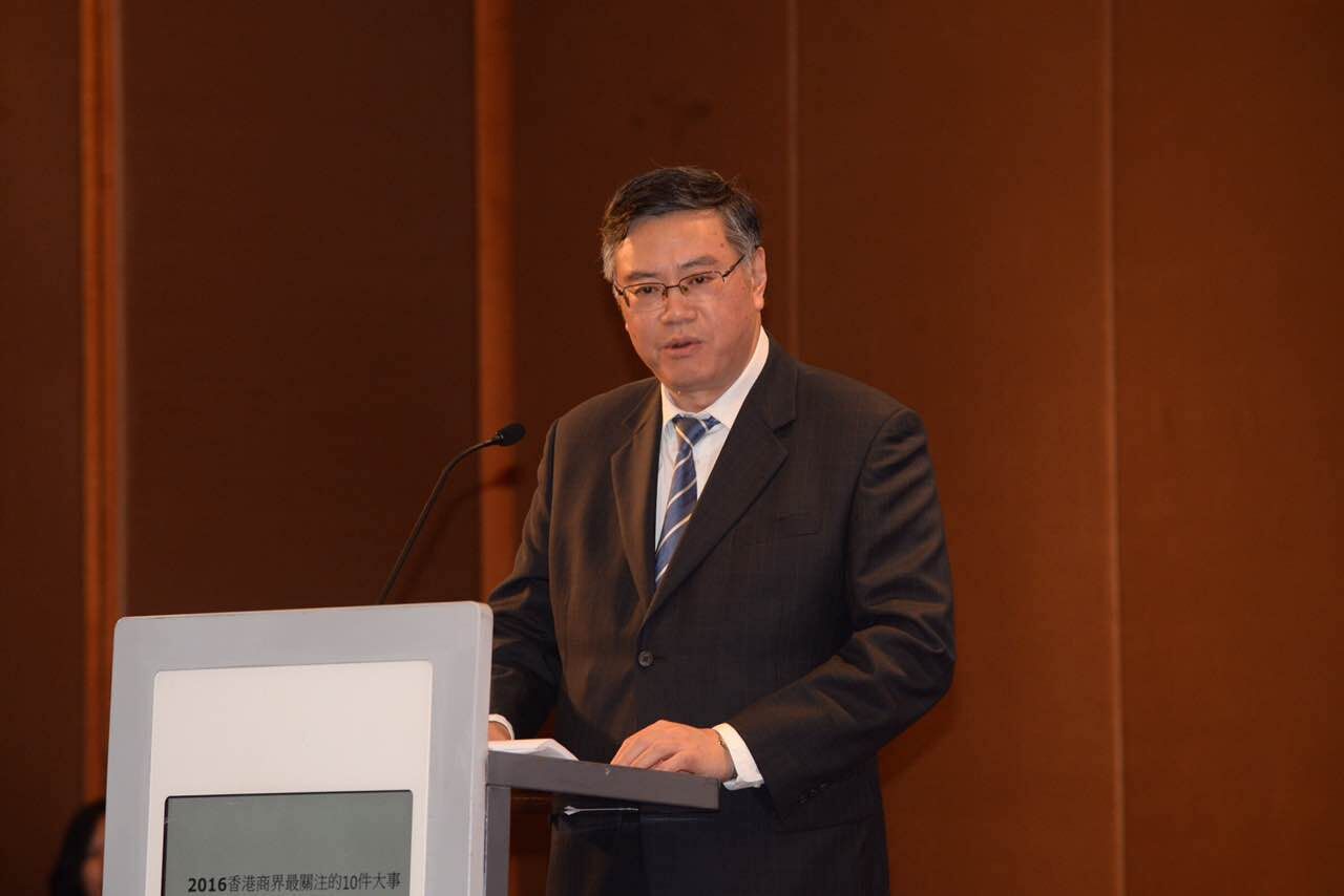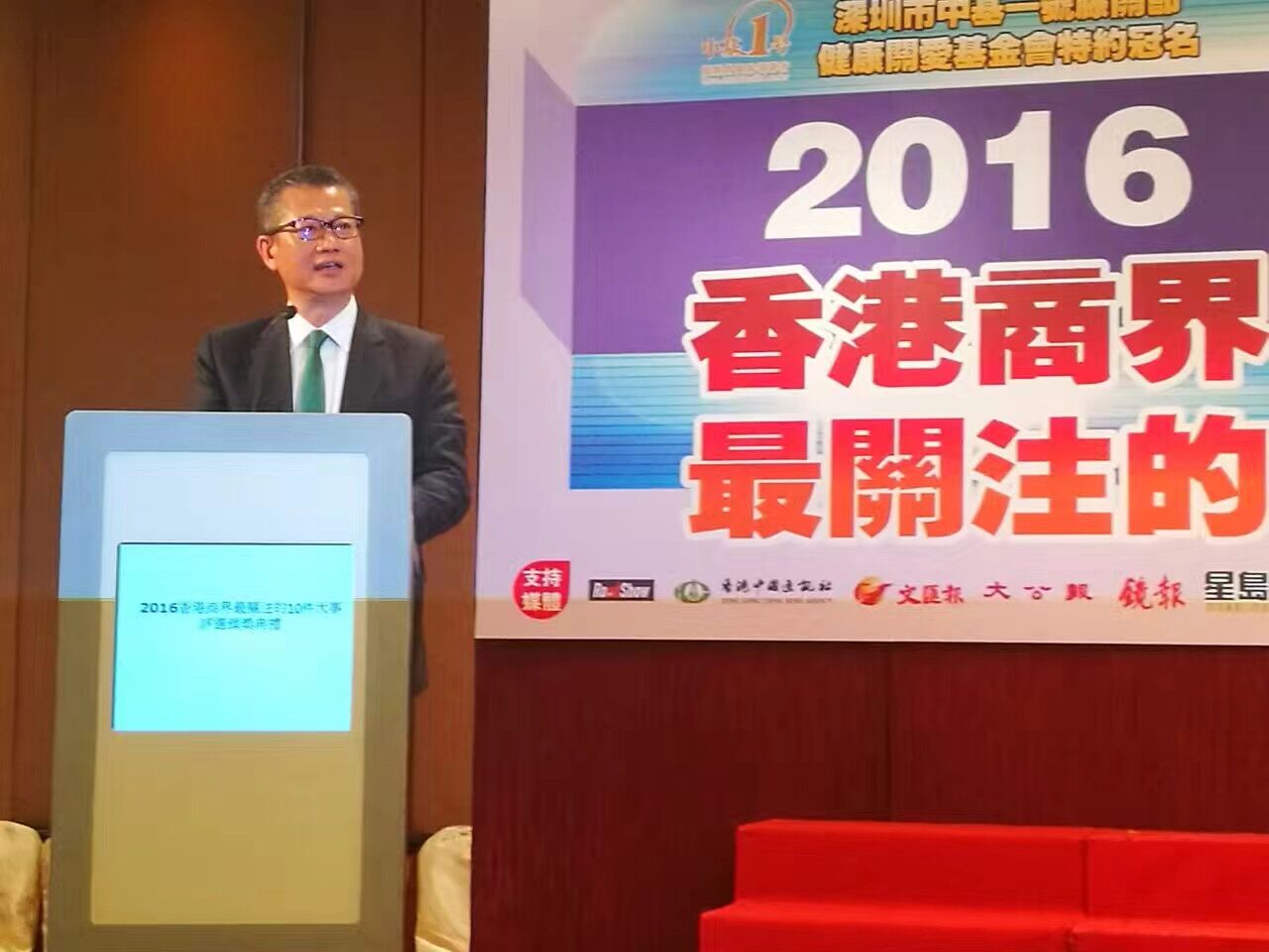 财政司司长陈茂波亦发表了讲话,祝贺评选活动举办成功。陳茂波稱2016年香港經濟增長或高於預期。2016年內地與香港深度合作,深港通,兩地基金互認,香港與內地互聯互通達新里程,有助鞏固香港地位及內地市場開放。香港中华厂商联合会会长李秀恒主持了揭晓环节。主办机构代表上台,分别为「2016香港商界最关注的十件大事」揭晓。