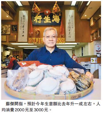 另外,海生行董事總經理蘇傑開表示,預計今年生意額與去年同期比較會升一成左右,而人均消費約2000元至3000元左右,因以往不少市民也會買海味送禮,但近年較少,故生意也較淡。又指,近年飯局少了,酒樓訂單亦減少,對生意影響也不少,但港人消費力仍在,只是遊客減少。