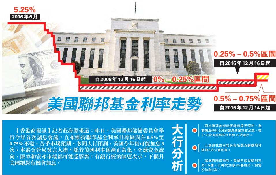 【香港商報网訊】記者莊海源報道:昨日,美國聯邦儲備委員會舉行今年首次議息會議,宣布維持聯邦基金利率目標區間在0.5%至0.75%不變,合乎市場預期。多間大行預測,美國今年仍可能加息3次。本港金管局發言人指,隨著美國利率逐漸正常化,全球資金流向、匯率和資產市場都可能受影響;有銀行經濟師更表示,下個月美國絕對有機會加息。