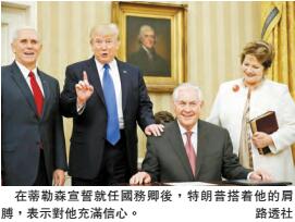 【香港商報网訊】美國國會參議院1日以56票贊成、43票反對的結果,通過特朗普提名的蒂勒森為美國國務卿。美國副總統彭斯帶領蒂勒森作為國務卿進行宣誓。宣誓儀式在白宮舉行,特朗普參加了該活動。蒂勒森在宣誓儀式上許諾代表所有美國人民。