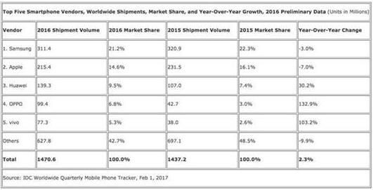第三方數據統計機構IDC近日公布了2016年全球智能手機出貨量數據。2016年全年,全球智能手機市場總共出貨14.7億部,是曆史最高的出貨量,但相比2015年的14.4億部僅增長了2.3%。而且中國、美國和巴西等大市場,都在今年結束了以往迅猛增長的趨勢。而出貨排名前五的手機廠商分別是三星、蘋果、華為、OPPO和vivo。
