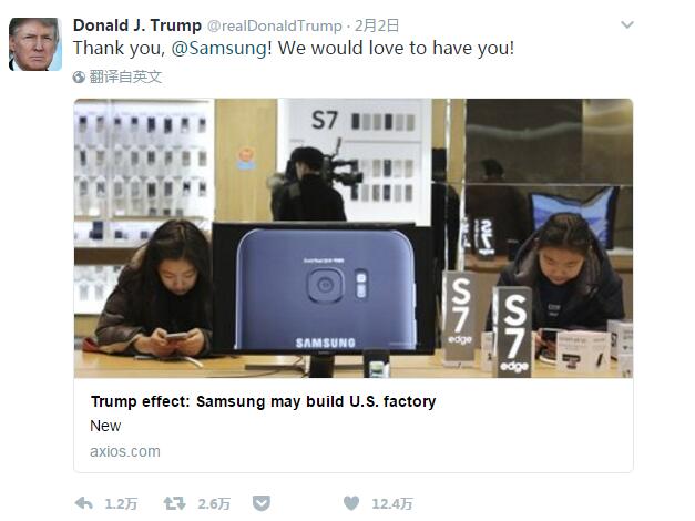 本報訊(記者 溫婧)日前,美國總統特朗普在推特上轉發了一則“三星將在美建廠”的消息,並表示感謝和歡迎三星。三星回應表示,還在評估在美的新投資需求,目前尚未確定投資金額和具體建廠地點。