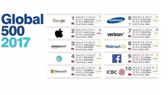 日前, 從事品牌價值評定的英國專業咨詢機構“Brand Frinance”推出了2017年度的全球品牌500強榜單,穀歌排名第一,品牌價值1094.7億美元,蘋果、亞馬遜分裂二三位,僅有55家中國品牌上榜。