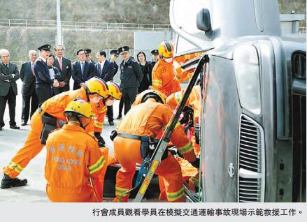 行會成員在消防處處長李建日陪同下,先參觀學院的模擬訓練設施,觀看學員在模擬鐵路站、燃料庫、船隻火警和坍塌事故搜救訓練場等區域示範救援工作。模擬訓練設施有助提升消防處人員應付大型緊急事故的專業知識和救援技巧。