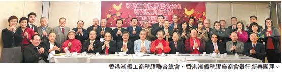【香港商報网訊】記者謝巧玲報道:一元復始,萬象更新。香港潮僑工商塑膠聯合總會、香港潮僑塑膠廠商會初七人日在尖東潮州城酒樓舉行新春團拜。該會會長許瑞勤帶領該會首長彼此祝賀,會董、會員百多人,歡聚一堂,共賀新禧,現場氣氛熱烈,一片喜氣洋洋。