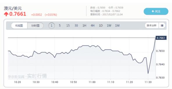 利率決議公布后,澳元兌美元短線走高。