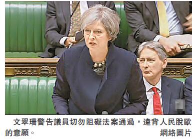 【香港商報网訊】英國下議院委員會當地時間周一起一連三日審議政府提交的脫歐法案,首相文翠珊警告議員切勿阻礙法案通過,違背人民脫歐的意願。