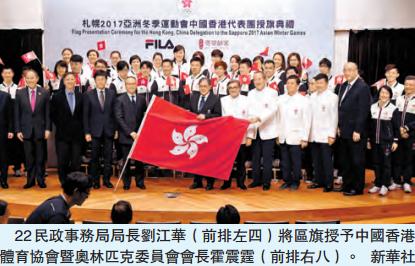 【香港商報網訊】民政事務局局長劉江華昨日在亞洲冬季運動會(亞冬運)中國香港代表團授旗典禮上,將特區區旗授予50名即將參加亞冬運的中國香港運動員,象徵全體香港市民對他們的祝福及支持。