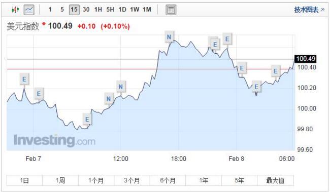 除了外儲公布影響外,2月7日,美元指數延續上漲且漲幅擴大,盤中最高漲至100.7。截至目前,美元指數報100.49。