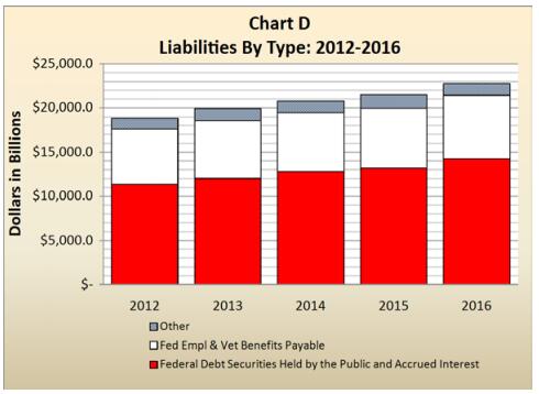 總負債為22.8萬億美元,主要包括(1)由公眾持有的聯邦政府債券以及應付利息14.2萬億美元(2)聯邦雇員和退休軍人應付福利7.2萬億美元。此處的“公眾”包括個人、公司、州與地方政府、聯儲銀行、外國政府以及聯邦政府以外的其他實體。