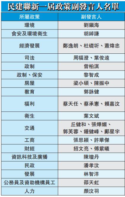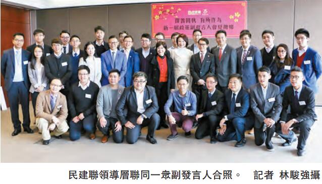 民建聯新一批政策副發言人昨日會見傳媒,全部共30人,包括26位男士及4名女士,平均年齡為28.5歲。民建聯立法會黨團召集人陳克勤昨日現身支持一眾副發言人,並於會上表示,民建聯自2004年起設立副發言人制度,希望讓更多新人獲得培訓和曝光機會,亦能讓他們協助政策發言人,跟進有關政策工作。