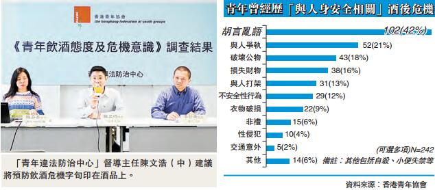 「青年違法防治中心」督導主任陳文浩表示,青年人過早接觸酒精會影響其腦部發展;青年對酒精的危機意識亦不高,不時有「一夜情」及醉酒後肢體碰撞的個案。他認為,部分青年對飲酒的意識存在謬誤,誤以為適量飲酒有助入睡及交際應酬和節慶活動都應該飲酒,但忽略其風險。