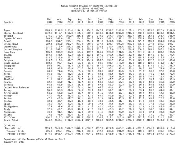 美國財政部公布的2016年11月美債持有情況