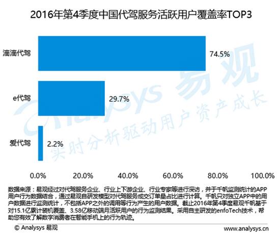 【香港商报网讯】易观日前发布的《2016年第四季度代驾市场报告》显示,滴滴代驾、e 代驾和爱代驾持续占据代驾市场前三把交椅。其中,滴滴代驾以74.5%的份额独占鳌头,大幅领先于份额为29.7%的e代驾。