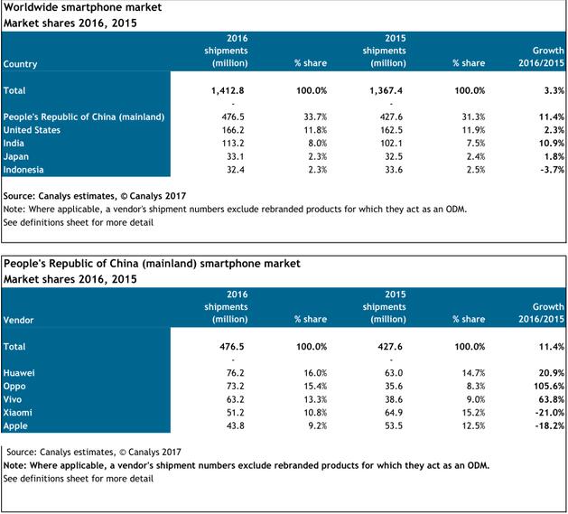 而根據華為消費者業務年初發布的2016年全年業績預期,2016年華為消費者業務智能手機發貨量達到1.39億台,同比增長29%。OPPO以及vivo暫未對外發布全球出貨數據。