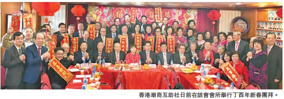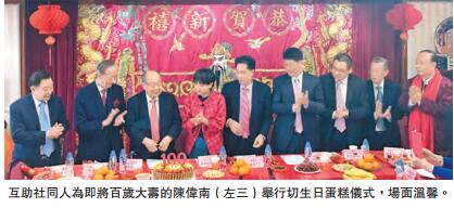 【香港商報網訊】記者謝巧玲報道:香港潮商互助社日前在該會會所舉行丁酉年新春團拜。中聯辦港島工作部部長吳仰偉、中西區民政事務處黃何詠詩專員、香港潮屬社團總會主席陳幼南、創會主席陳偉南,潮商互助社理事長陳賢豪及名譽社長、榮譽社長、副理事長等出席,首長、社友濟濟一堂,恭賀新禧,喜慶雞年。席間並為即將百歲大壽、德高望重的陳偉南舉行切生日蛋糕儀式,與會者大唱生日歌,溫馨熱鬧。