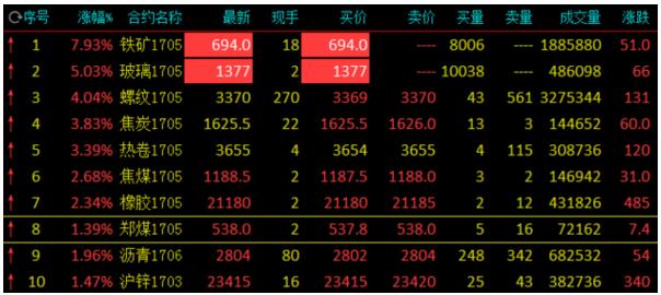 目前,玻璃漲停,漲幅5%;螺紋鋼漲4%,焦炭、熱卷、焦煤均上漲。