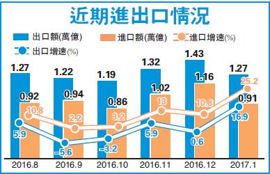 【香港商報網訊】海關總署昨日發布數據顯示,中國1月出口總值2.18萬億元人民幣,同比增長19.6%。其中,出口1.27萬億元,增長15.9%;進口9111.7億元,增長25.2%,貿易順差3545.3億元,收窄2.7%。專家認為,進出口數據皆好於預期,受益於內外環境的改善,同時亦有去年基數較低、春節因素擾動的影響。內外環境短期內復蘇勢頭將持續,預計進出口亦將繼續復蘇,但美國的貿易政策是一大不確定因素,影響不可低估。進口增速連續六月高於出口,顯示內需好轉大於外需,說明中國出口導向的經濟增長模式正在進一步發生變化。香港商報記者伍敬斌