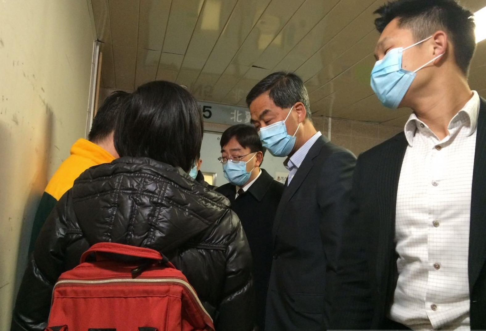 港鐵列車縱火發生當天深夜,行政長官梁振英、食物及衛生局長高永文到廣華醫院探望傷者。