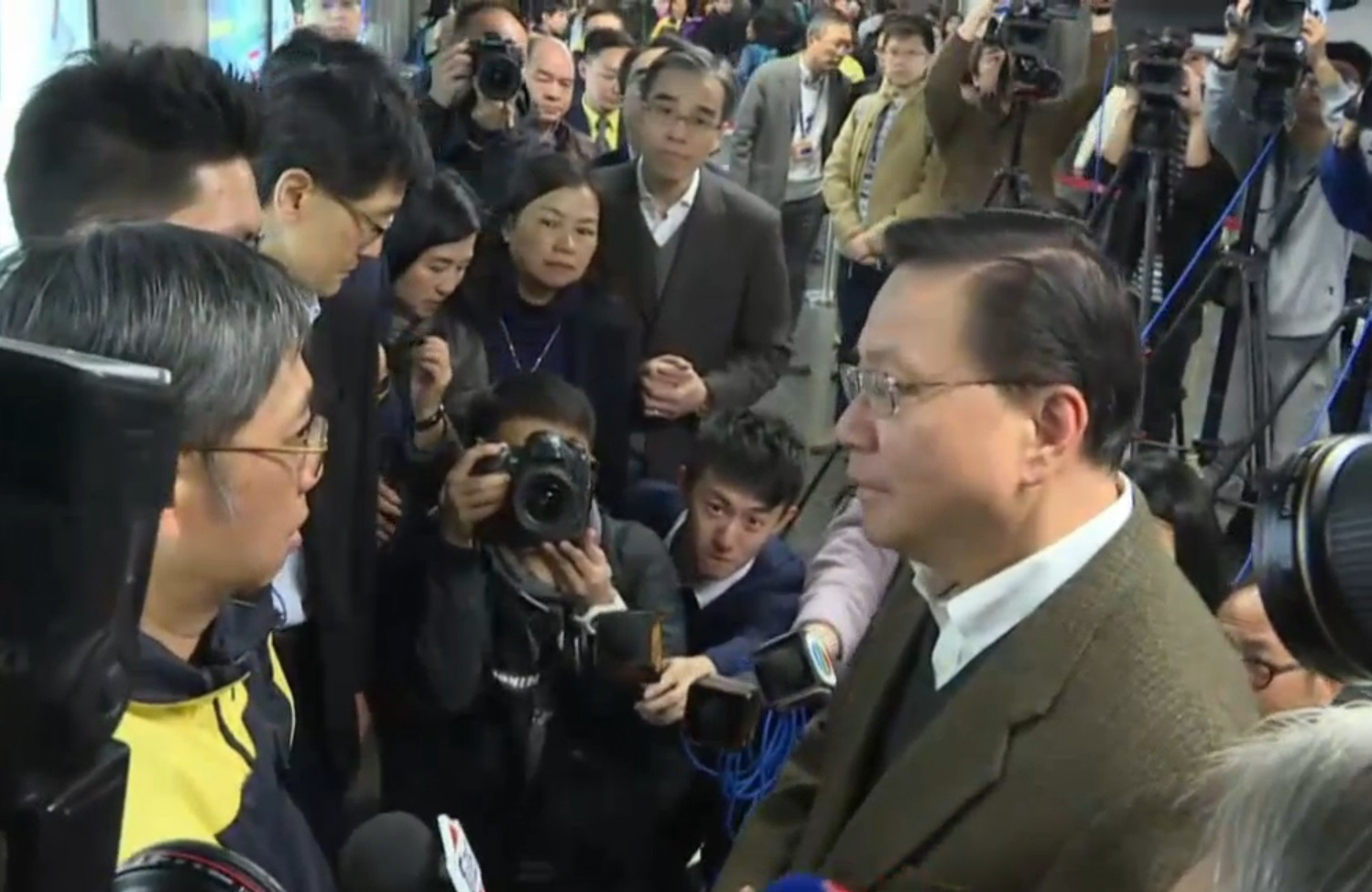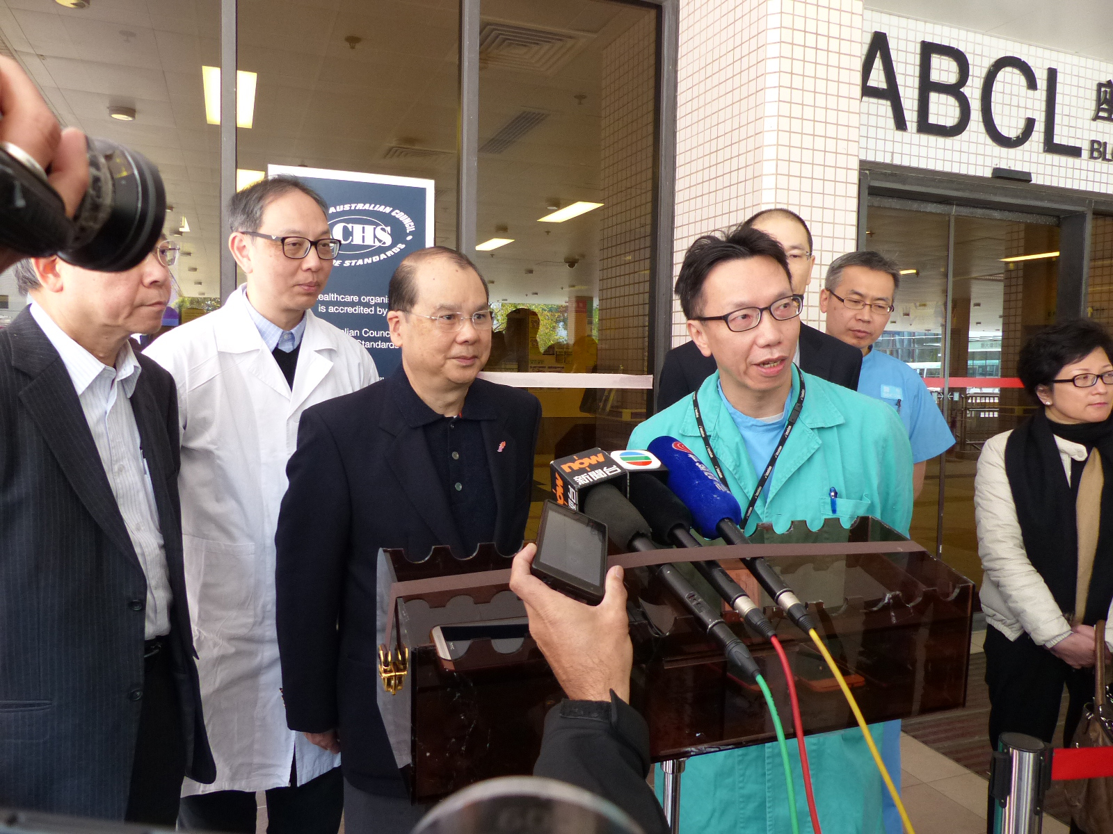 政務司司長張建宗及伊利沙伯醫院外科顧問醫生唐嘉倫(著綠袍者)向傳媒介紹傷者情況。