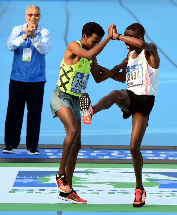 埃塞俄比亞選手比拉古(前左)衝過終點後跳舞慶祝勝利。
