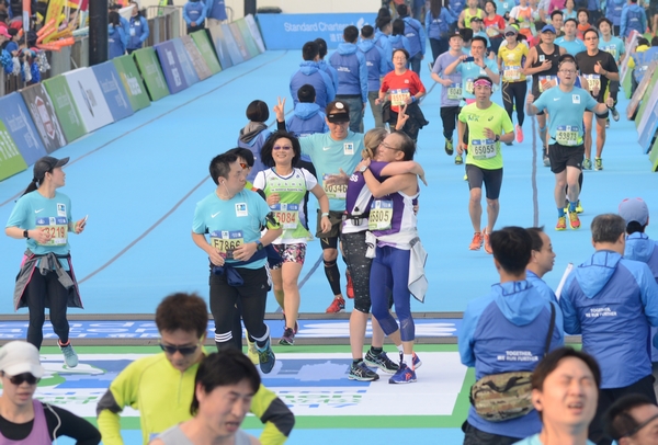 維園終點線,跑手擁抱賀完成賽事。 記者 麥鈞傑攝