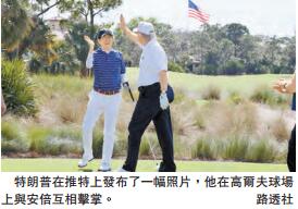 【香港商報訊】特朗普當地時間11日邀請到訪的安倍晉三,前往他在佛州的私人度假村位於丘比特鎮的高爾夫球場切磋球技。記者沒有獲安排采訪,但特朗普其后在推特上發布一幅照片,見到他和安倍都舉高手互相擊掌,未知是否打出一個好球。但當他們享受打球時,兩位第一夫人梅拉尼婭和安倍昭惠去了附近的博物館和日式庭園參觀。
