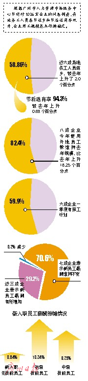 “免費提供早餐,員工宿舍整潔;提供系統培訓,關注員工成長”。隨著節后異地務工者陸續返鄉,企業也“打開招聘模式”,為吸引應聘者,有企業給自家福利編了個順口溜,表示每年花在培訓上兩三百萬元。調查數據顯示,異地務工人員春節返鄉和節后返崗率都有提升,分別為58.86%和94.3%。超過八成企業表示維持原有用工規模,比去年上升18.25個百分點。按照返鄉率、返崗率推算,全市節后企業將需補員18.16萬人,較2016年減少了0.75萬人,企業用工情況平穩。