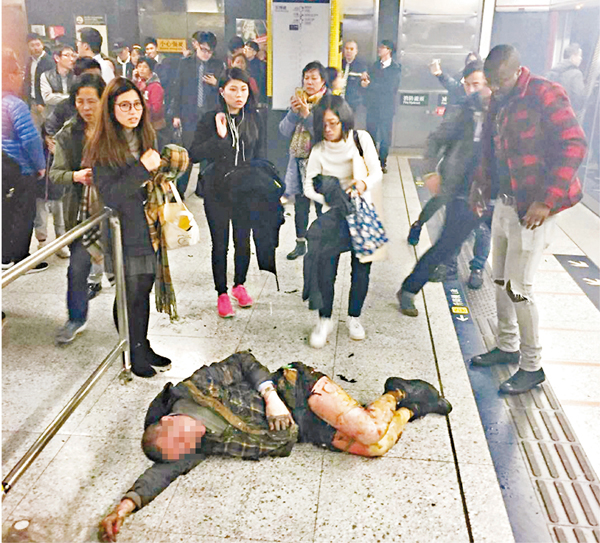 事发当日车厢冒烟起火后,港铁尖沙咀站月台满布被火灼伤的男女乘客,据在广华医院留医的32岁男伤者邓先生称,当时他站在疑犯身旁,不久被不明液体溅中衣服火,他身上刚巧有一盒菊花茶,遂“唧”出菊花茶淋湿身上衣衫方便呼吸,不过,他仍遭烧伤鼻子及双手。