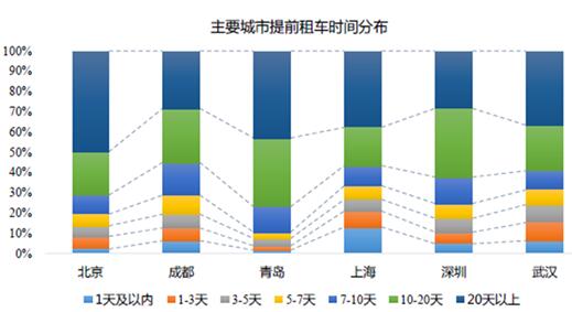 节假日租车的一大特性是提前订车的用户多,正所谓“身未动心先行”。滴滴出行租车大数据显示,北方城市人们更倾向于提前规划行程,以北京、青岛为例,提前10天以上预订租车的人数占比超过70%,而南方城市如成都、深圳、武汉等,该比例在55%左右。