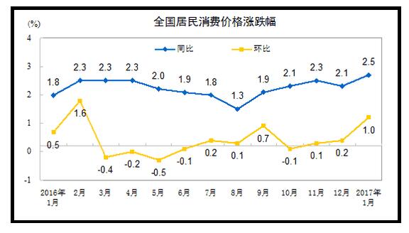 2017年1月份,全國居民消費價格總水平同比上漲2.5%。其中,城市上漲2.6%,農村上漲2.2%;食品價格上漲2.7%,非食品價格上漲2.5%;消費品價格上漲2.2%,服務價格上漲3.2%。