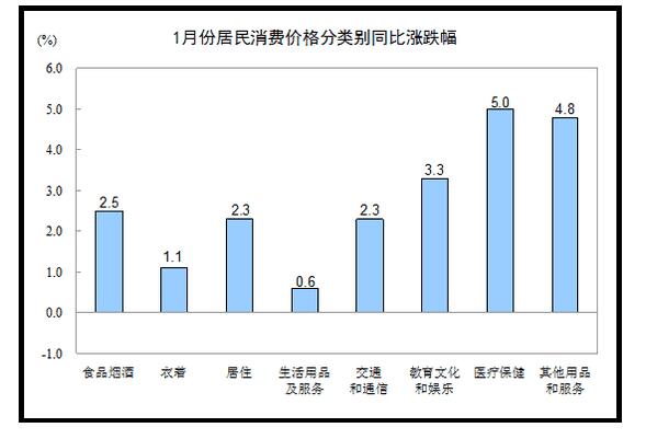 1月份,其他七大類價格同比均有所上漲。其中,醫療保健、其他用品和服務、教育文化和娛樂、居住、交通和通信、衣著、生活用品及服務價格分別上漲5.0%、4.8%、3.3%、2.3%、2.3%、1.1%和0.6%。