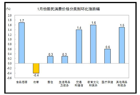 1月份,其他七大類價格環比六漲一降。其中,教育文化和娛樂、其他用品和服務、交通和通信、醫療保健、居住、生活用品及服務價格分別上漲1.6%、1.5%、1.4%、0.6%、0.3%和0.3%;衣著價格下降0.4%。