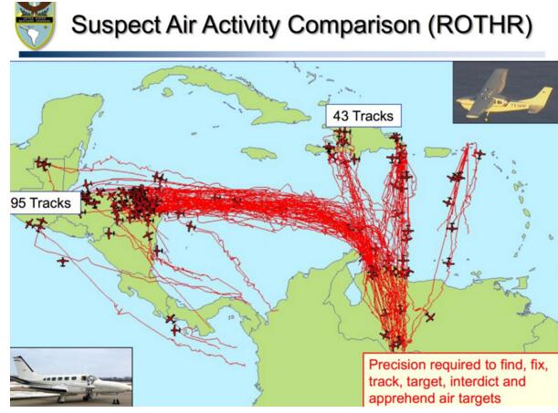 美軍南方司令部公布的2010年由委內瑞拉運出毒品的航班示意圖