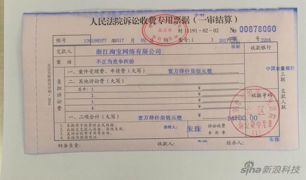 阿裏巴巴方面提供的立案收費票據