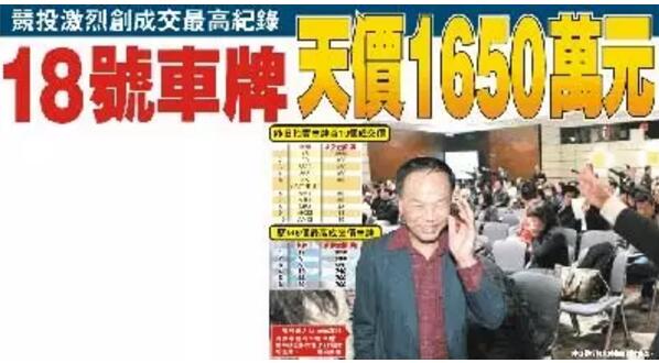 2008年新春車牌拍賣會上,“18”號車牌經43回激烈叫價,最終被商人張程光以天價1650萬元奪得,成為香港史上最貴車牌,并與其“XX 18”車牌號碼湊成一對。