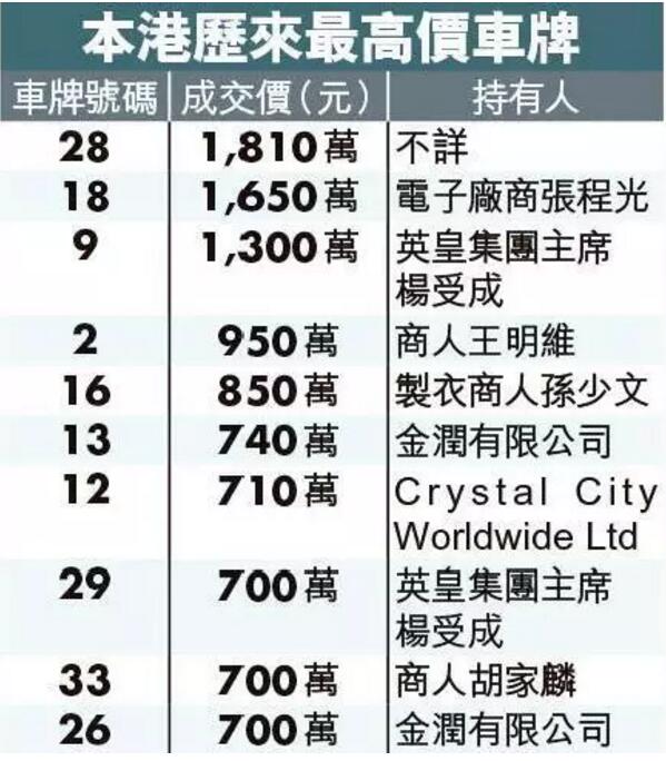 其他高價車牌,如“16”號車牌2011年以850萬元由制衣配料公司東主孫少文投得;再如“13”號車牌,看似英文字母“B”,加上粵語諧音“實生”,2010年拍賣會上經14口價,最終由神秘男子以740萬投得。還有,“12”號車牌2005年拍得710萬;“26”號車牌2010年亦由上文神秘男以700萬投得;楊受成除了擁有“9”號車牌外,2008年他還以700萬投得“29”號車牌。身價700萬的還有“33”號車牌,由達暢公司老板富商胡家麟在1997年投得。今年拍得560萬的“81”,基本可以排上20強之列。